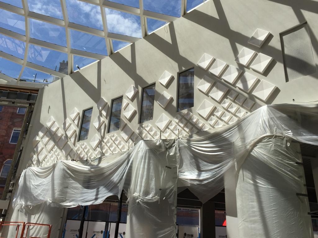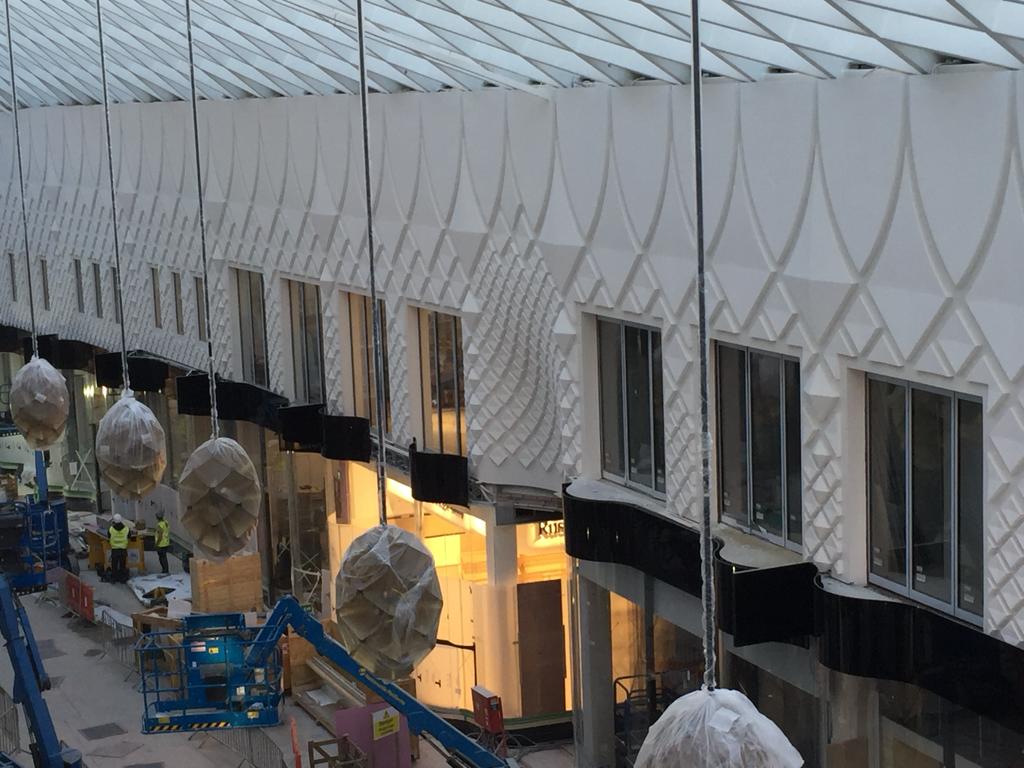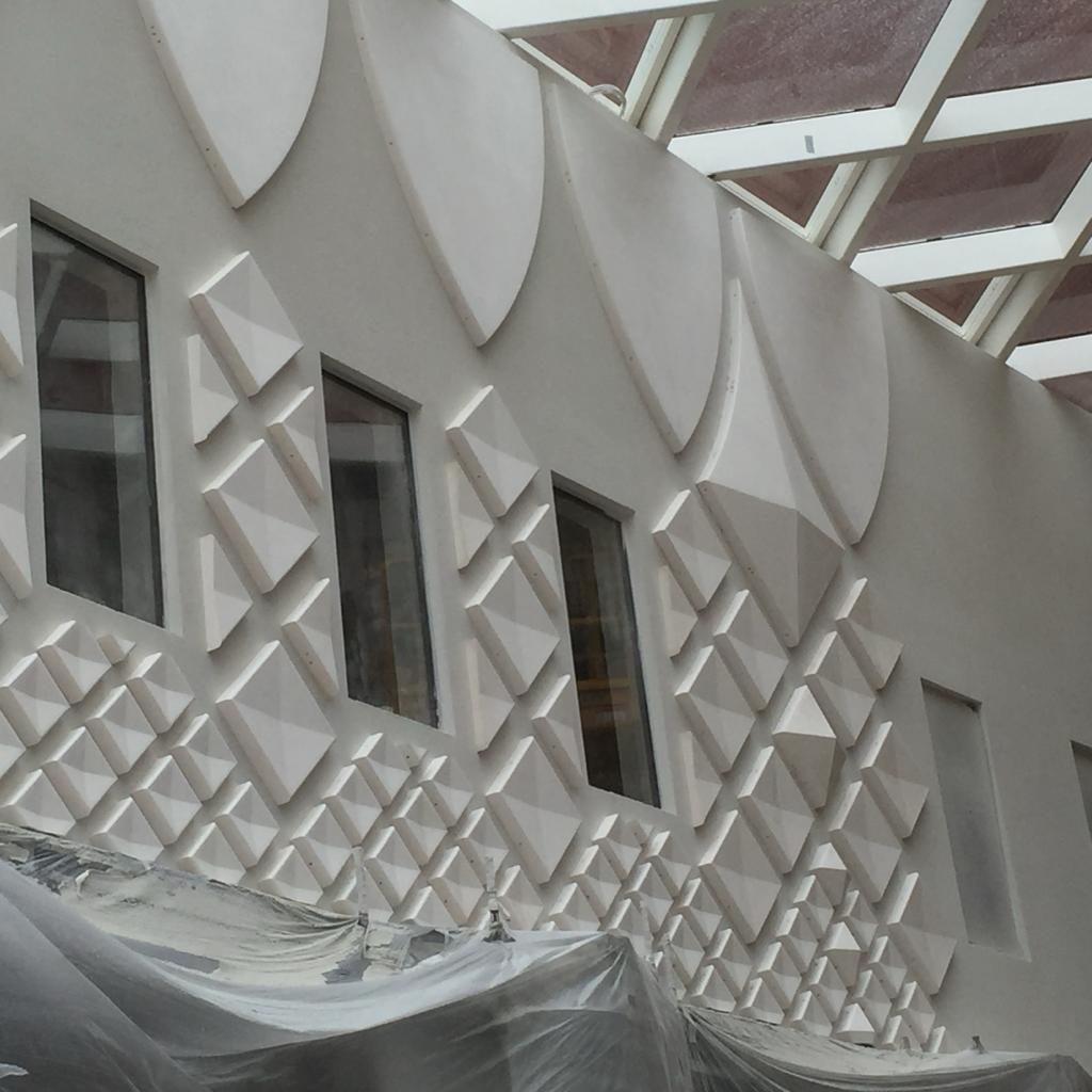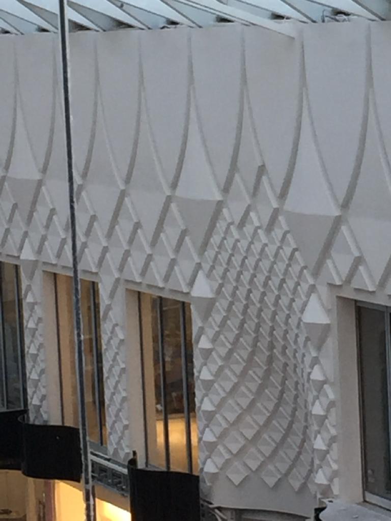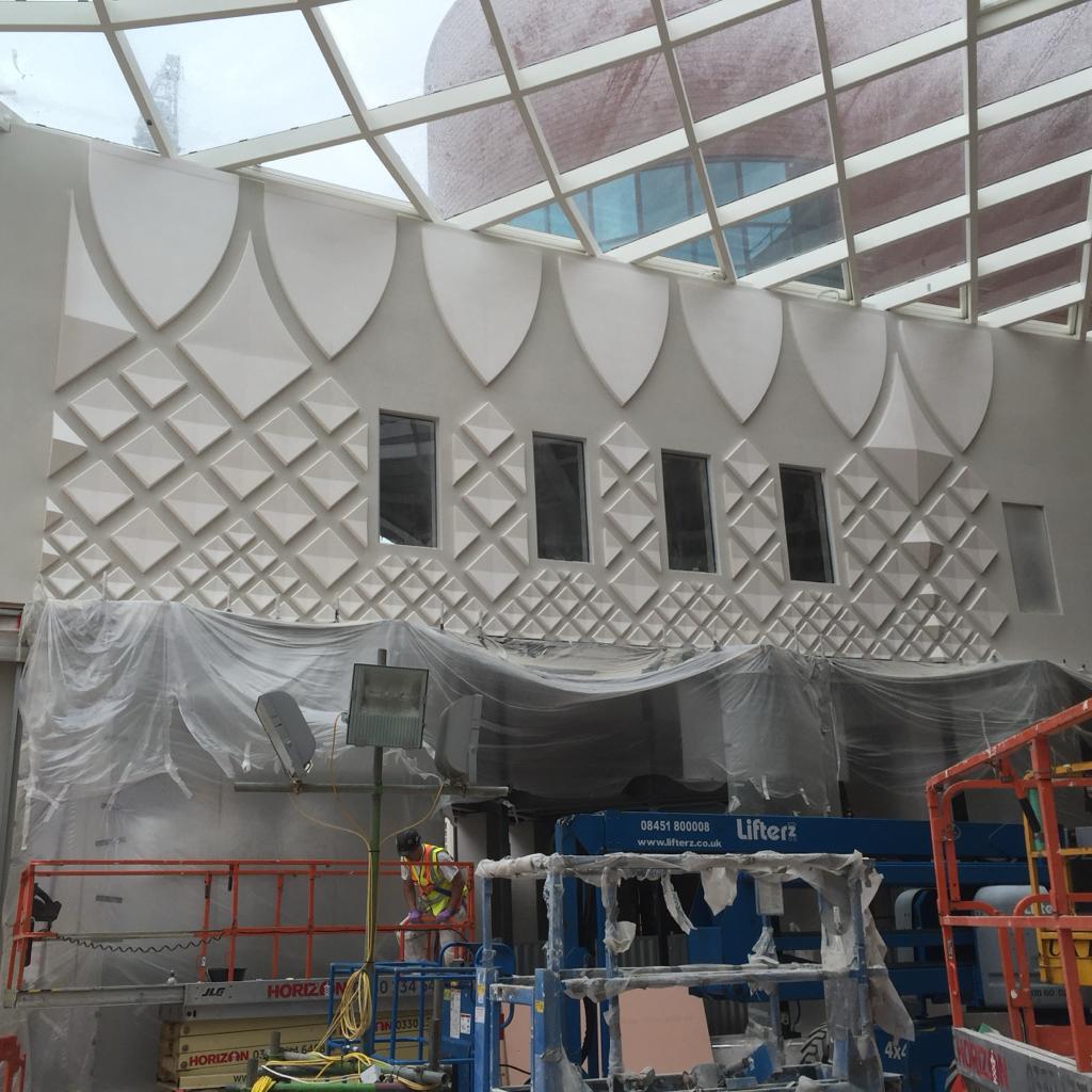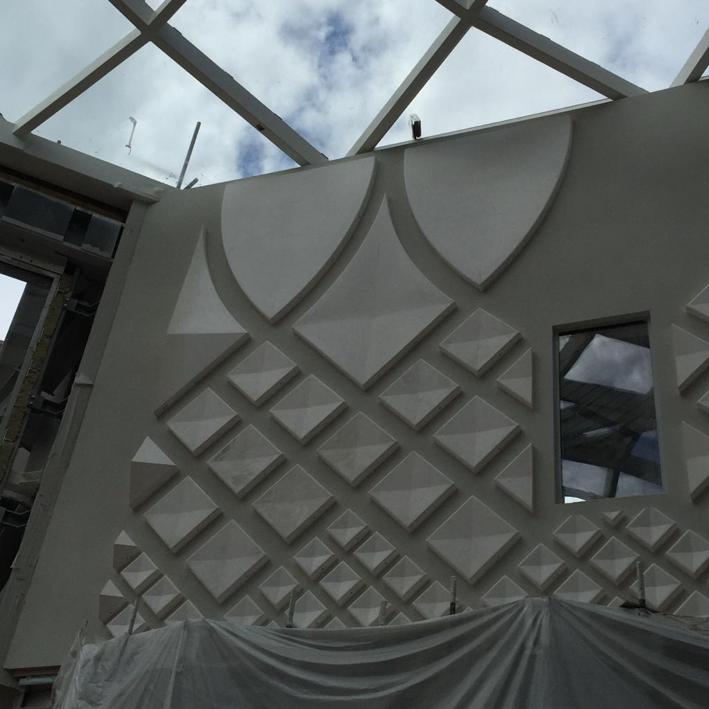 Embarking on the transformation of a Leeds shopping center with an innovative outdoor ambiance, our team was commissioned with a distinctive task – the manufacturing, to the architect's intricate design, of multiple uniquely shaped diamond Glass Reinforced Gypsum (GRG) panels. These panels were strategically affixed to a textured multi-radius background, aiming to achieve a visually impactful and unparalleled aesthetic. The result was a shopping center with a dynamic and distinctive appearance, setting it apart in both design and atmosphere.
